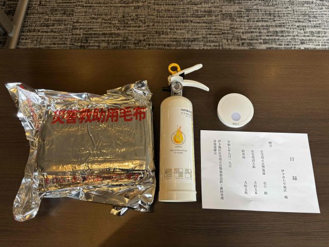この贈呈式は、一般財団法人全国消防機器協会から伊予市大平地区が、住宅用火災警報器100個、住宅用消火器25本及び防炎毛布25枚の寄贈を受けたことから、消防庁が実施している「住宅防火・防炎キャンペーン」(実施期間9月1日~21日)に併せて行ったものです。