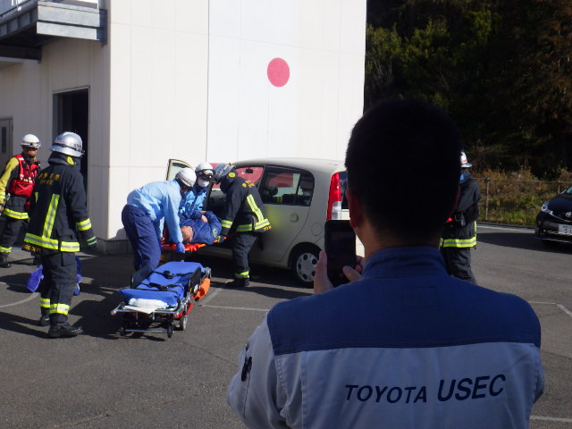 今回の訓練では、軽四自動車の単独事故により、車内から1名が出られない状況を想定し、バックボードを用いた傷病者の保護および搬出までの一連の活動や、活動中の安全管理、情報共有および指揮命令系統の確認など、実災害に即した訓練を行いました。消防隊、救急隊の相互の連携を図りながら、現場を想定した緊張感のある訓練を実施することができました。