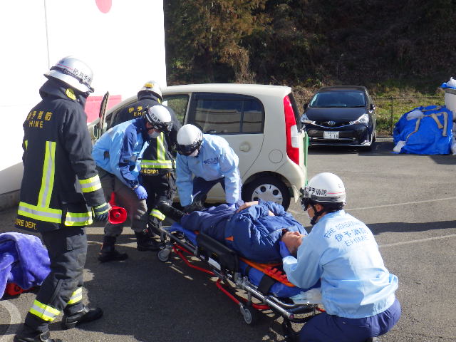 令和8年1月22日、砥部消防署において株式会社トヨタユーゼックTAA愛媛サテライト会場様より無償提供いただいた車両を使用し、交通事故を想定した消防隊、救急隊連携の車外救出訓練を行いました。
