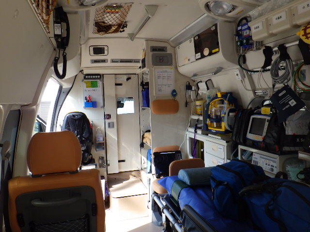 また、車内には自動式心臓マッサージ器、半自動式除細動器、AED、人工呼吸器など、最新の医療機器を搭載しています。